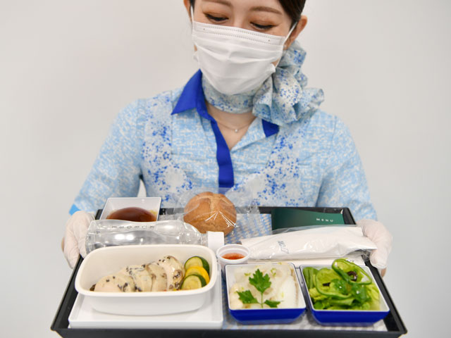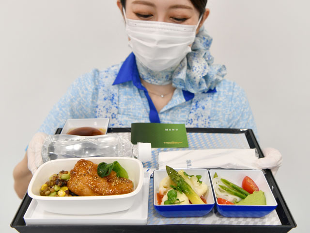 ANAの低糖質・低脂肪・低カロリー機内食を紹介する客室乗務員=21年9月27日 PHOTO: Tadayuki YOSHIKAWA/Aviation Wire
