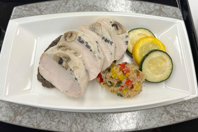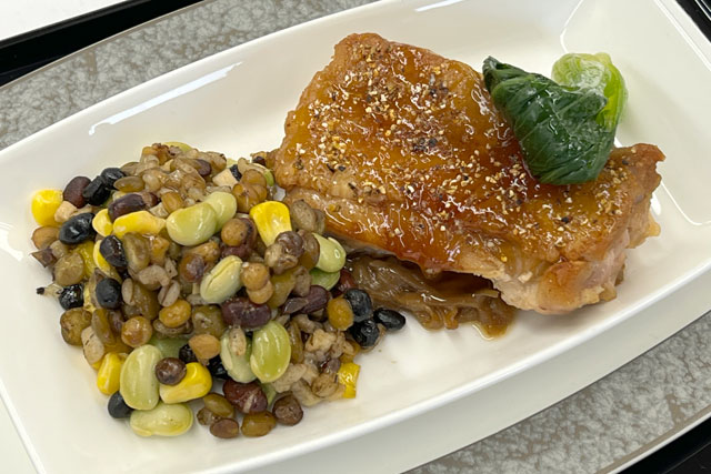 低糖質・低脂肪・低カロリー共通メニューは「チキンのパプールとマッシュルームのピューレ 彩野菜とキヌアのサラダ仕立て」、低塩メニューは「チキンのロースト蜂蜜ビネガーとオニオンコンフィー雑穀物を添えて」をそれぞれメインに据えた。また、デザートとして紅茶のゼリーを共通で添える。