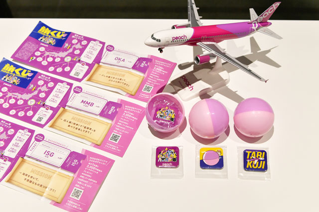 旅くじのカプセルには指定された行き先のみ使用できる「ピーチポイント」の交換コードと缶バッジが入っており、交換コードをピーチのウェブサイトで入力して航空券と引き換える。場所は渋谷パルコ6階「CYBERSPACE SHIBUYA」で、販売期間は12月末まで。スマートフォンによるキャッシュレス決済サービス「PayPay(ペイペイ)」でのみ購入できる。