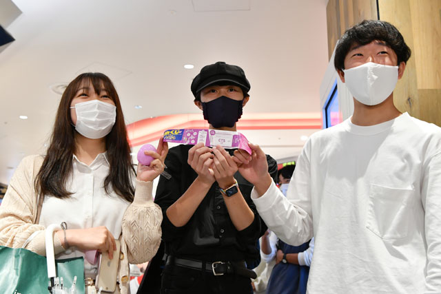 渋谷PARCOに設置されたピーチの「旅くじ」最初の来店客となった(左から)井出さん、大谷さん、渡辺さん=21年10月13日 PHOTO: Tadayuki YOSHIKAWA/Aviation Wire