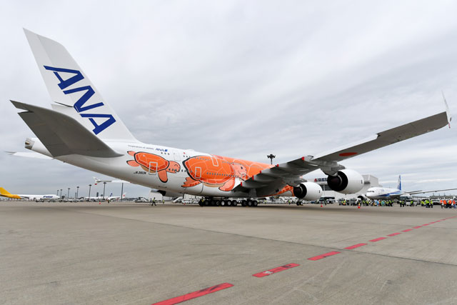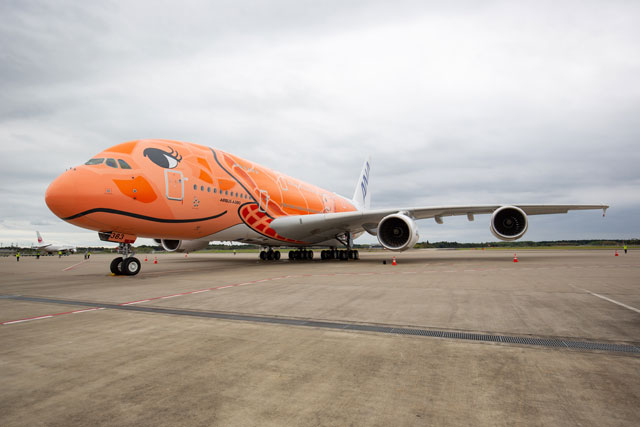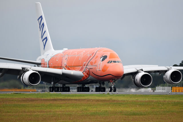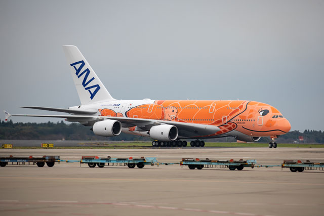 ANAのA380、まつげのあるオレンジ3号機が成田到着 就航は未定