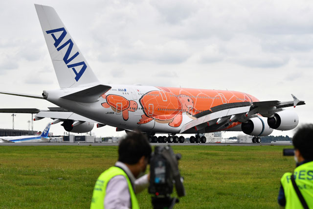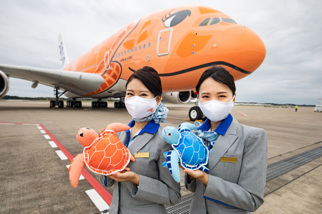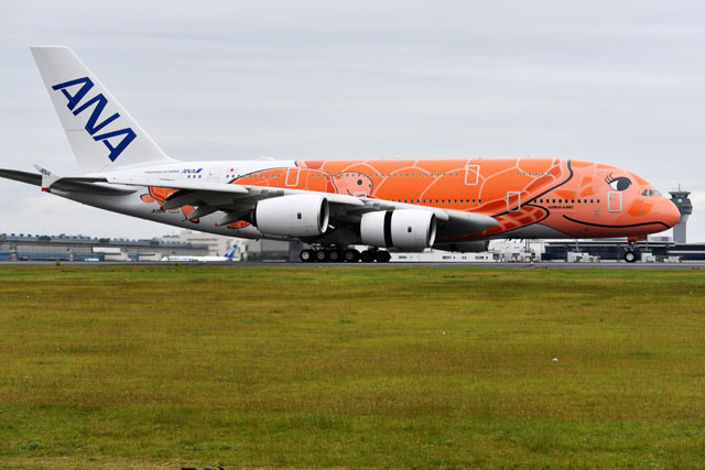 空飛ぶウミガメ、沖縄へ 写真特集・ANA A380那覇初飛来(21年9月26日)