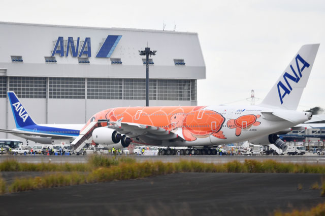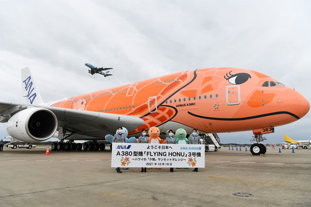 「空飛ぶウミガメ」の意味を持つ全日本空輸(ANA/NH)のエアバスA380型機「FLYING HONU(フライング・ホヌ)」の3号機(登録記号JA383A)が10月16日、成田空港へ到着した。A380の製造は完了しており、同型機を最多保有するエミレーツ航空(UAE/EK)以外では最後の引き渡しとなった。