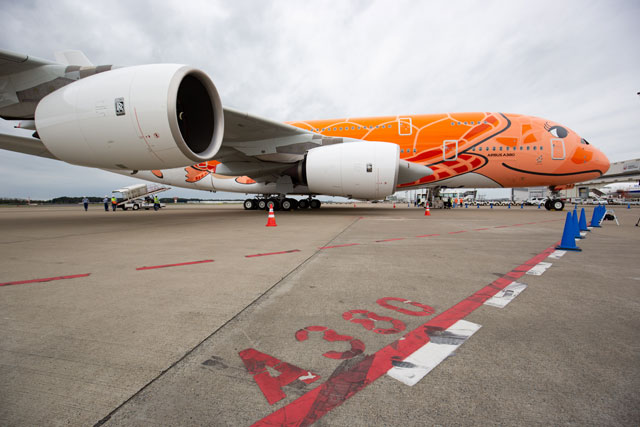 ANAを傘下に持つANAホールディングス(ANAHD、9202)は、総2階建てとなるA380の新造機を3機発注。成田-ホノルル線の専用機材で、全機にハワイの空と海、夕陽をイメージした特別塗装を施しており、初号機(JA381A)が青(ANAブルー)、2号機(JA382A)が深緑(エメラルドグリーン)、3号機がオレンジ(サンセットオレンジ)と1機ごとに色が異なる。機首の表情も、正面を見る初号機、ほほ笑む2号機、まつげを描いた3号機と違いがある。
