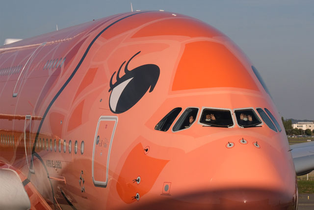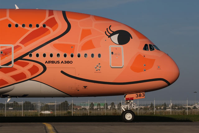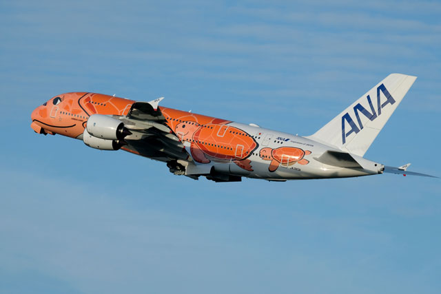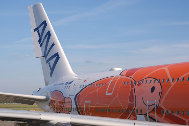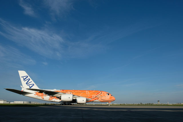ANAのA380は成田-ホノルル線の専用機材で、全機にハワイの空と海、夕陽をイメージした特別塗装を施しており、初号機(JA381A)が青(ANAブルー)、2号機(JA382A)が深緑(エメラルドグリーン)、3号機がオレンジ(サンセットオレンジ)と1機ごとに色が異なる。機首の表情も、正面を見る初号機、ほほ笑む2号機、まつげを描いた3号機と違いがある。