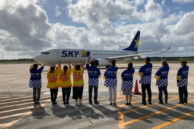 下地島空港を出発する便を見送るスカイマークの社員ら(同社Twitterから)