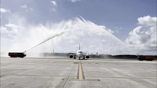 下地島空港で放水アーチの歓迎を受けるスカイマークの到着便(同社Twitterから)