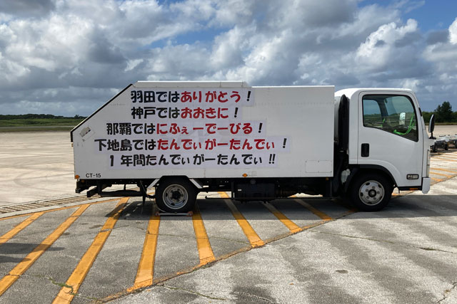 下地島空港の地上支援車両には羽田と神戸、那覇、下地島での「ありがとう」の言葉が掲げられた(同社Twitterから)