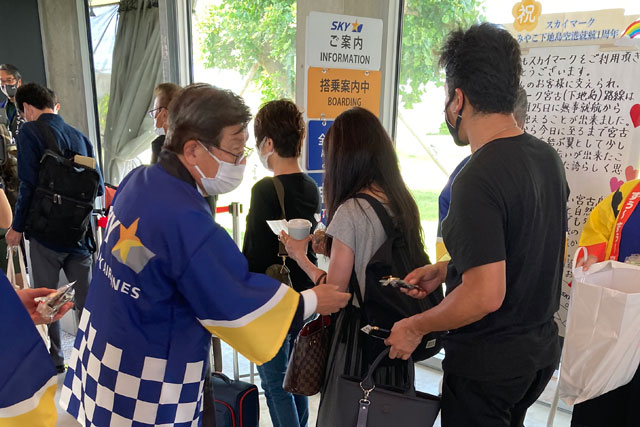 下地島空港で乗客に記念品を手渡すスカイマークの洞社長(同社Twitterから)