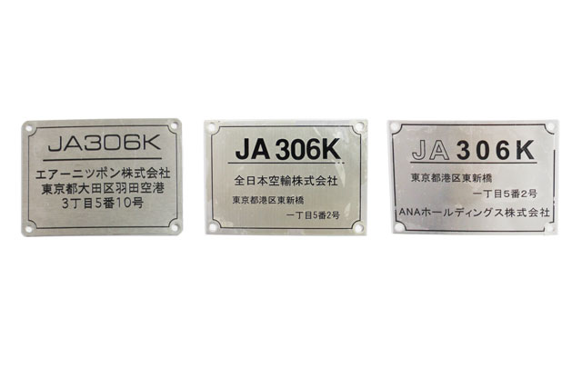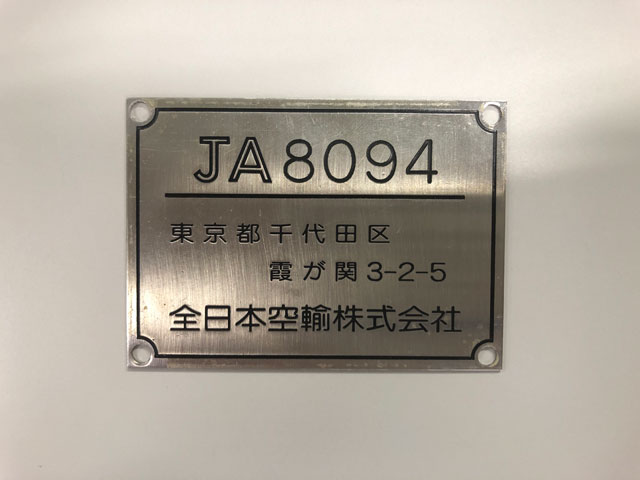 機体識別板は、JA8094のコックピットに取り付けれていた一点もので、取り付けた時点の本社所在地である霞が関の住所が記載されている。大きさはタテ5.5cm × ヨコ7.5cmで重さは約4.0g。