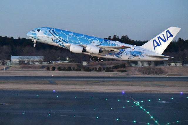 成田空港を離陸するANAのA380による初日の出フライトNH2030便=21年1月1日 PHOTO: Tadayuki YOSHIKAWA/Aviation Wire