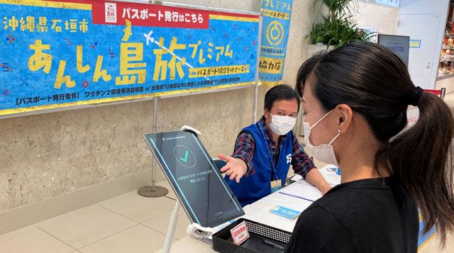 石垣島で顔認証技術を活用してPCR検査の陰性結果を確認する実証実験を実施するJALとNEC(JAL提供)
