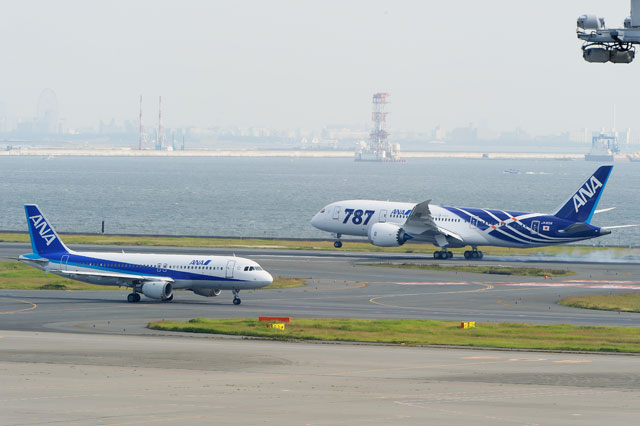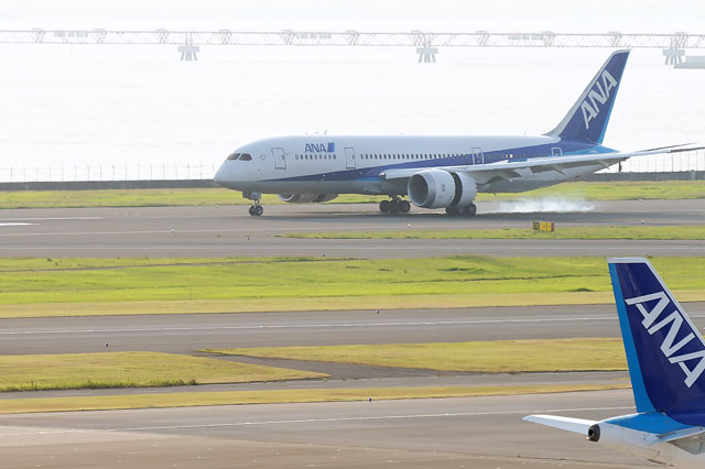 羽田空港に着陸するANAの787初号機JA801A(右)=11年9月28日 PHOTO: Tadayuki YOSHIKAWA/Aviation Wire