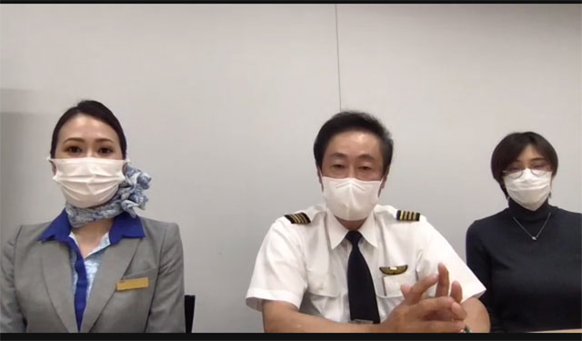 オンラインツアー後に取材に応じる787の開発段階からパイロットとして携わってきたANAの塚本さん(中央)と司会を務めた客室乗務員の兪さん、イベントを企画したANA Xの何さん(スクリーンショット)
