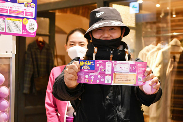 福岡PARCOに設置されたピーチの「旅くじ」初来店者の小松さんは成田が当たった=21年12月14日 PHOTO: Tadayuki YOSHIKAWA/Aviation Wire