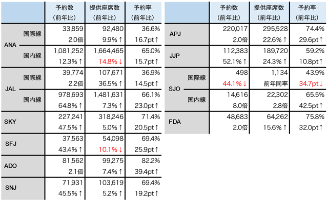 航空各社が発表した年末年始の予約状況(各社の発表資料からAviation Wire作成)