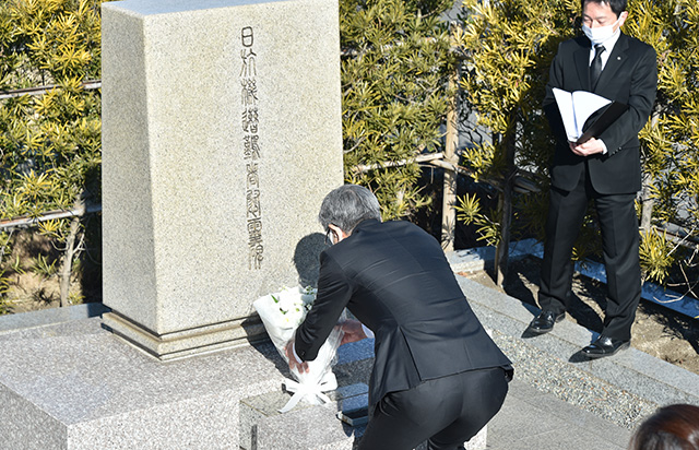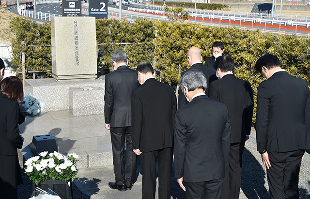 慰霊行事には赤坂社長のほか、清水新一郎副社長と安全推進本部の堤正行本部長、総務本部の植田英嗣本部長、人財本部の小枝直仁本部長、運航本部の立花宗和本部長が参列。花と線香を手向け、冥福を祈った。