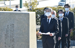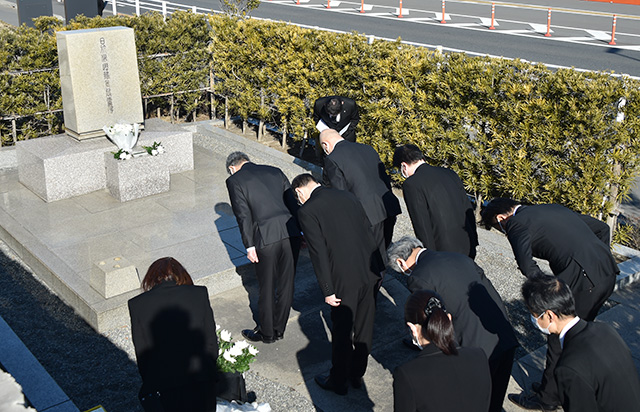 羽田沖事故慰霊碑に安全を誓うJALの赤坂社長=22年2月9日 PHOTO: Yusuke KOHASE/Aviation Wire