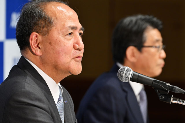 ANAホールディングスの新社長に就任する芝田専務(左)と片野坂社長=22年2月10日 PHOTO: Tadayuki YOSHIKAWA/Aviation Wire