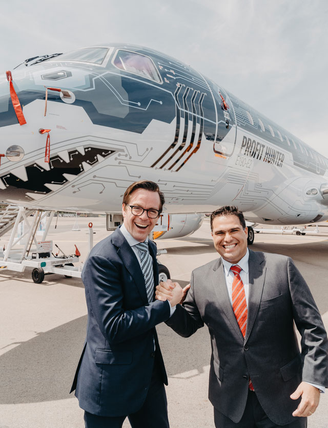 テックシャークを初披露するエンブラエル民間航空機部門のアルジャン・マイヤー社長兼CEO(左)と同部門アジア太平洋地域副社長のラウル・ヴィラロン氏(同社提供)