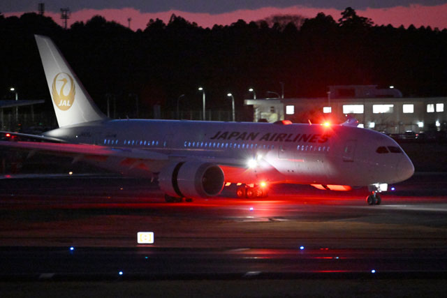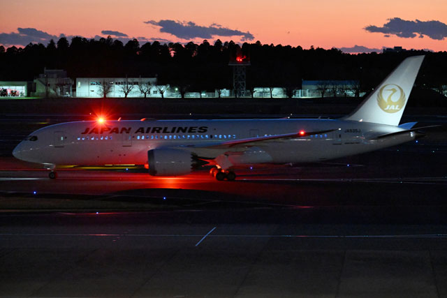 成田空港に着陸する金の鶴丸ロゴを描いたJALの787-8 JA835Jによる北京発JL860便=22年2月21日 PHOTO: Tadayuki YOSHIKAWA/Aviation Wire
