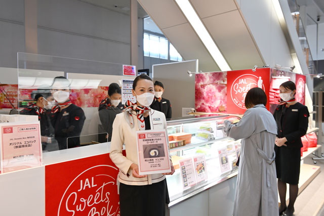 日本航空(JAL/JL、9201)は3月25日、客室乗務員が地域の特産品を使ってレシピを考案したスイーツ「JAL Sweets Box(JALスイーツボックス)」の販売を羽田空港で始めた。第1弾の今回は高知や兵庫、茨城などの名産品を使い、ロールケーキなど4種類をそろえたが、昼過ぎに完売する商品も出た。26日まで。