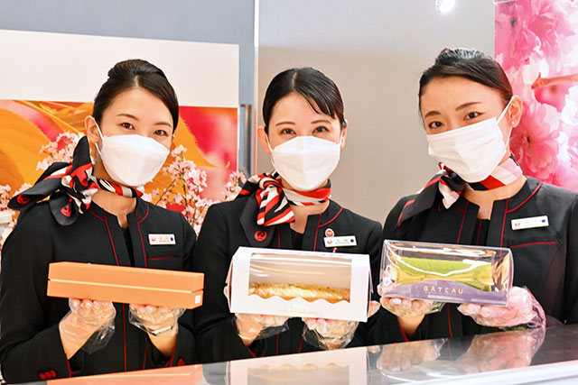 羽田空港でJAL Sweets Boxの(左から)「マカロン 47s」「高知県産柚子のパウンドケーキ」「兵庫県丹波産黒大豆と宇治抹茶のロールケーキ」を紹介する客室乗務員=22年3月25日 PHOTO: Tadayuki YOSHIKAWA/Aviation Wire