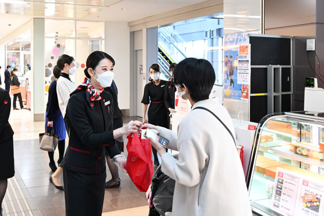 羽田空港でJAL Sweets Boxのスイーツを来店者に手渡す客室乗務員(左)=22年3月25日 PHOTO: Tadayuki YOSHIKAWA/Aviation Wire