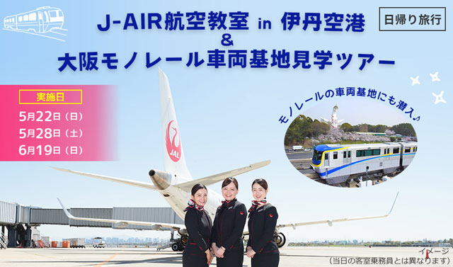 ジェイエア(JAR/XM)と大阪モノレール、関西エアポート(KAP)の3社は3月29日、伊丹空港で開く航空教室と大阪モノレールの車両基地見学をセットにしたツアーを5月と6月に開催すると発表した。