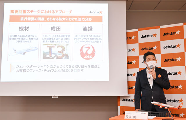 JALとの提携拡大を発表するジェットスター・ジャパンの片岡優社長=22年4月14日 PHOTO: Tadayuki YOSHIKAWA/Aviation Wire
