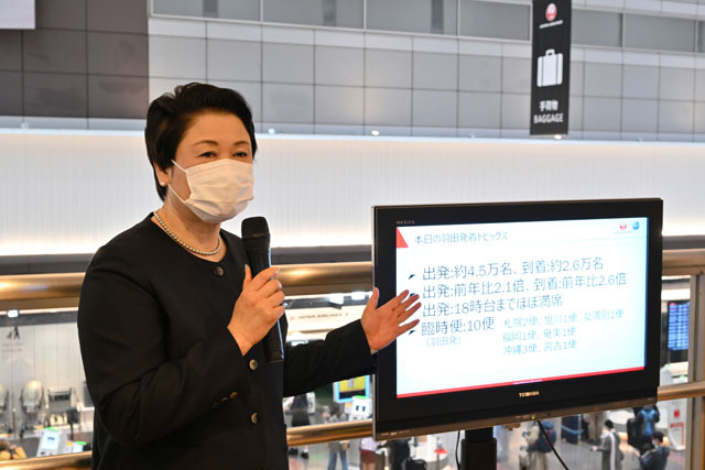 ANAの小山田亜希子東京空港支店長は「空港で働く者としてうれしい。活気があるのが励みだ」と述べ、今年は子連れやお年寄りの姿が目立ち、家族旅行が増えているという。