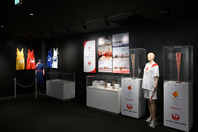リニューアルオープンしたJALのスカイミュージアムの東京オリンピック・パラリンピックの聖火輸送にちなんだ展示=22年5月1日 PHOTO: Tadayuki YOSHIKAWA/Aviation Wire