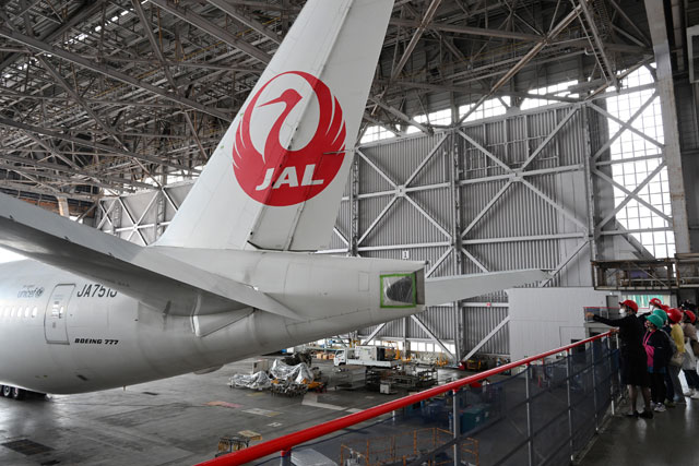 JALの格納庫に駐機中の777-300 JA751Jを見学する来館者=22年5月1日 PHOTO: Tadayuki YOSHIKAWA/Aviation Wire