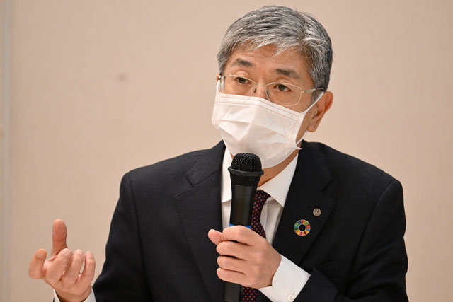 23年3月期業績予想を発表するJALの赤坂祐二社長=22年5月6日 PHOTO: Tadayuki YOSHIKAWA/Aviation Wire