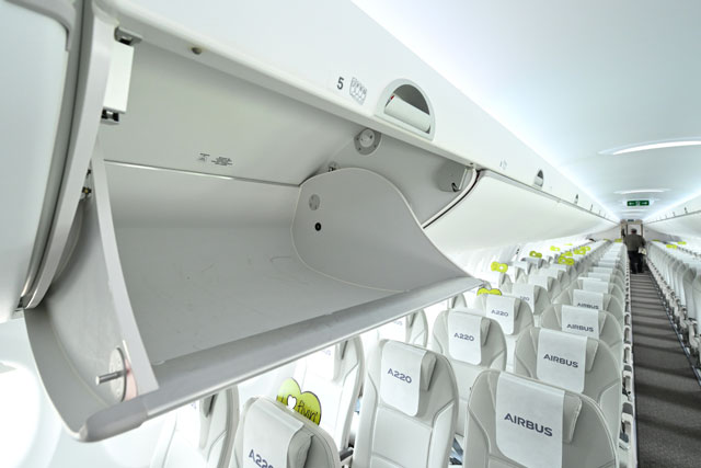 羽田空港で公開されたエア・バルティックのA220-300の手荷物収納棚=22年5月9日 PHOTO: Tadayuki YOSHIKAWA/Aviation Wire
