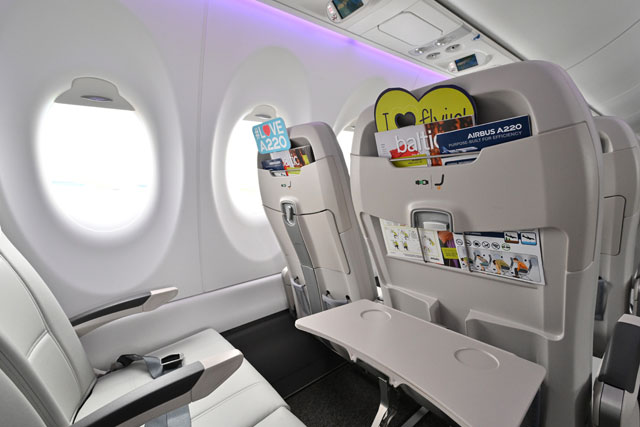 エアバスは5月9日、小型機のA220-300型機を羽田空港で報道関係者などに公開した。アジア太平洋地域でのデモンストレーションツアーの一環で、ラトビアのエア・バルティック(BTI/BT)の機体(A220-300、登録記号YL-ABH)が飛来した。大きな窓や手荷物収納棚を備える快適性や、環境性能の高さをアピールしている。