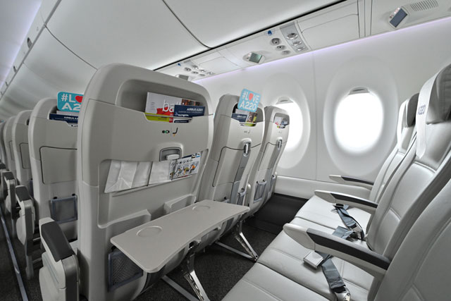 客室はキャリーバッグを4つ収納できる大型のオーバーヘッドビン(手荷物収納棚)や、A320と比べて15%大きい窓など、居住性の高さもアピールポイントだ。