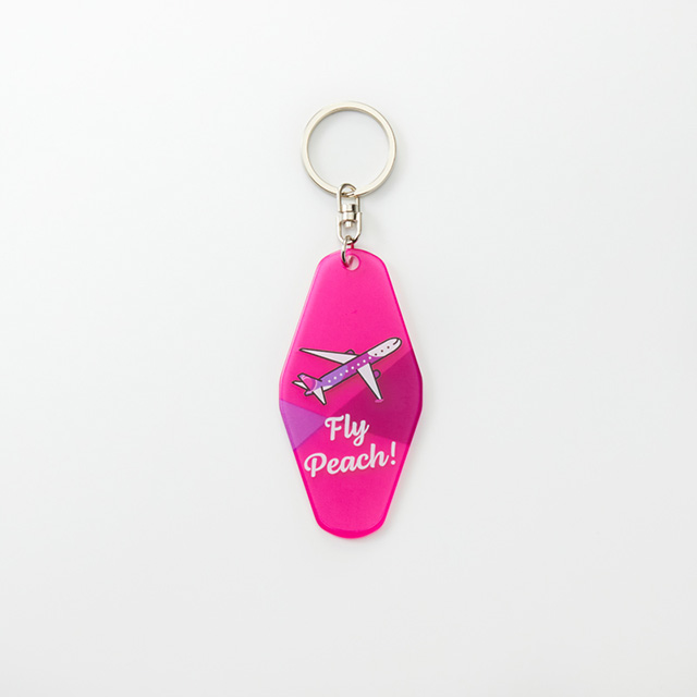 「CAスカーフキーホルダーFly Peach!」は、スカーフをアクリル板に封入して製作した。ピーチが取り組むサステナビリティ(持続可能性)の一環として提供する。ピーチのオンラインショップのほか、機内販売でも取り扱う。1つ税込み900円。7月からは、スカーフを再利用したフライトタグ型のキーホルダーも販売を予定する。
