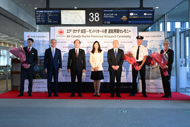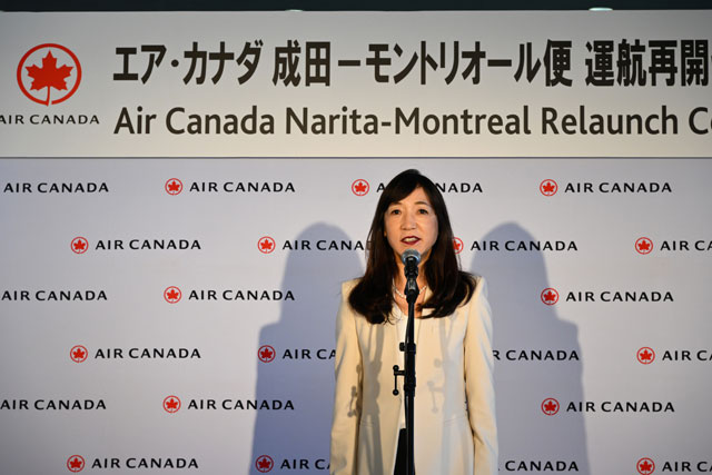 成田空港で開かれた運航再開の記念式典で、エア・カナダのワイス貴代・アジア太平洋地区統括支社長は「2020年3月から2年以上運休し、アジア発着唯一のモントリオール線を再開できてうれしい。モントリオールは紅葉の名所で、ビジネスや留学、旅行などでカナダ各地や米国へ渡航できる。日本の入国規制の早期緩和を期待している」とあいさつした。