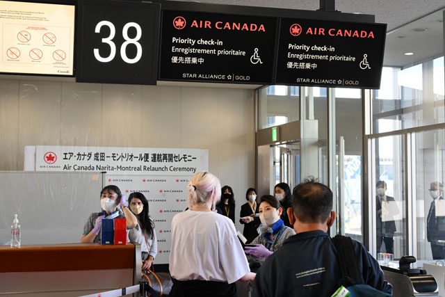成田空港でエア・カナダのモントリオール行き再開初便AC6便に搭乗する乗客=22年6月4日 PHOTO: Tadayuki YOSHIKAWA/Aviation Wire