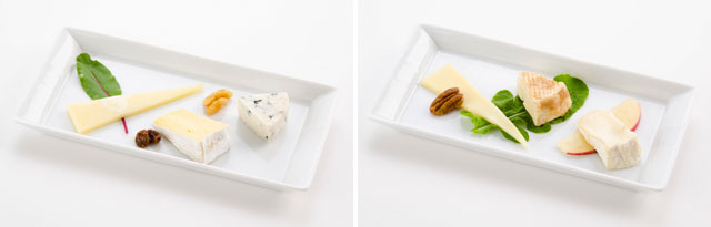 ビジネスクラスで9月から11月まで提供する国産チーズ(左)と12月から14年2月までのもの(JAL提供)
