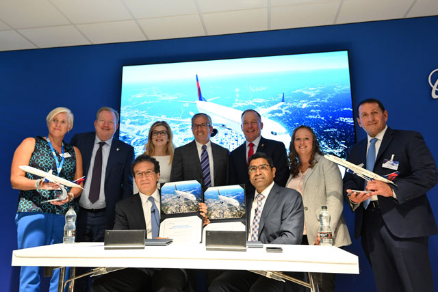 ファンボロー航空ショーで開かれた737-10発注の調印式に出席するデルタ航空とボーイングの関係者ら=22年7月18日 PHOTO: Tadayuki YOSHIKAWA/Aviation Wire