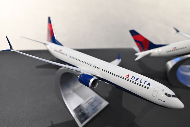 ファンボロー航空ショーの調印式会場に展示されたデルタ航空の737-10の模型=22年7月18日 PHOTO: Tadayuki YOSHIKAWA/Aviation Wire