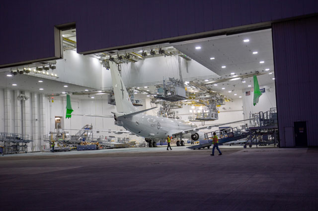 P-8は、小型旅客機の737-800をベースに開発された対潜水艦、対水上戦、情報収集、監視、偵察を担う多目的哨戒機で、2004年6月14日にローンチ。胴体は737-800、主翼は737-900を基に開発された。ボーイングの737製造ラインで組み立てられ、胴体には軍用の部品や装備、運用に必要な配線やシステムが追加される。その後、機体はボーイングの防衛・宇宙・セキュリティ部門(BDS)に引き渡され、軍用システムの取り付けや試験が行われた後、顧客へ納入される。