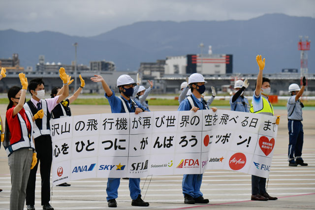 福岡空港で横断幕を手に出発便を見送る航空9社の社員=20年9月14日 PHOTO: Tadayuki YOSHIKAWA/Aviation Wire