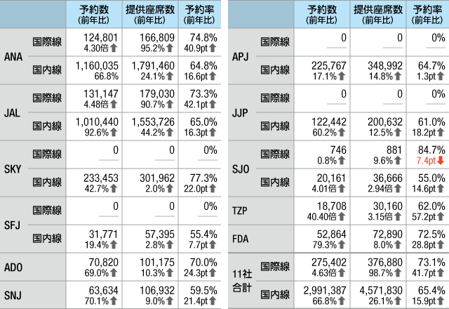 11社の発表値を合計すると、予約数は国際線が前年同期比4.63倍の27万5402人、国内線は66.8%増の299万1387人。提供座席数は国際線が2倍近い98.7%増の37万6880席で、国内線は26.1%増の457万1830席となった。11社平均の予約率は国際線が41.7ポイント上昇し73.1%、国内線は15.9ポイント上昇し65.4%となっている。