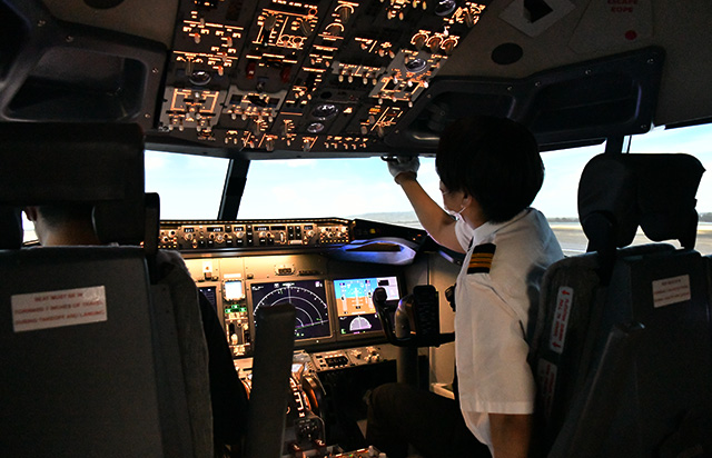 ホテル内に737 MAXのシミュレーターを設置。前政府専用機「B-747-400」のスペアパーツを活用した客室のモックアップも併設しており、8月1日にオープン予定です。