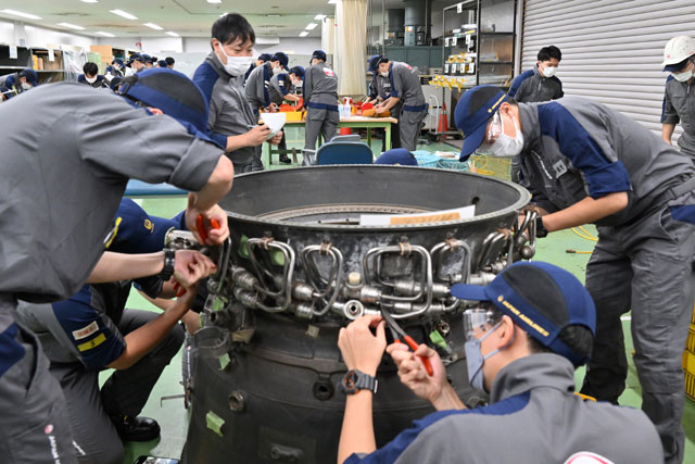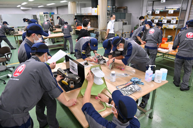 「セイフティーワイヤーがけ」「15種類のフルード当て」「ツールチェック」「間違い探し」など、5種類の競技に1チーム6人、5チーム対抗で挑み、団体に加えて個人でも競った。廃棄品を活用した教育用エンジン部品を使ったセイフティーワイヤー(安全線)がけでは、本番を想定して安全や品質を意識して作業できるかなどが評価のポイントになり、潤滑油や作動油、除氷液など15種類の液体名を当てたり、素早く正確にツールボックス(道具箱)を確認できるか、教育用に用意している実際の部品や整備書類のサンプルに仕込まれた間違いなどを指摘できるかなどを競った。