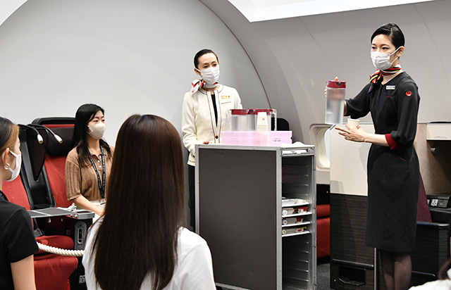 仕事体験では、本物のポットや紙コップ、サービスカートを使用し、客室乗務員がサービスのポイントを説明する。参加者はドリンクの提供を体験した。また、訓練で使用している国際線の食事トレイなども展示し、食器の重さも体感した。