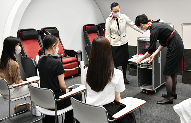日本航空(JAL/JL、9201)は8月17日、羽田空港にある見学施設「SKY MUSEUM(スカイミュージアム)」で、高校生や大学生を対象とした客室乗務員の仕事体験プログラムを開催した。格納庫など通常の見学に仕事体験を加えたもので、午前中は30人が参加した。